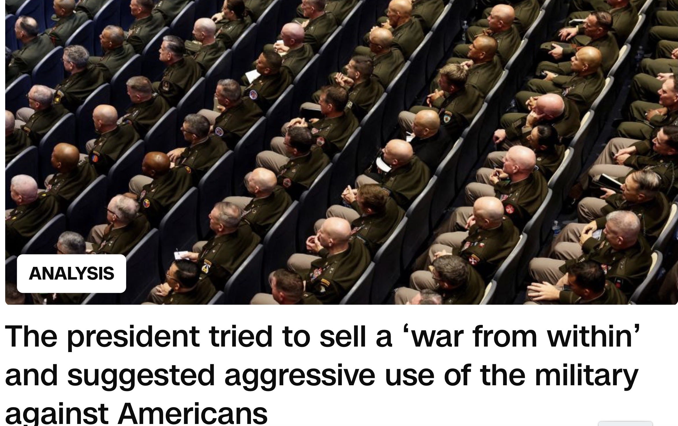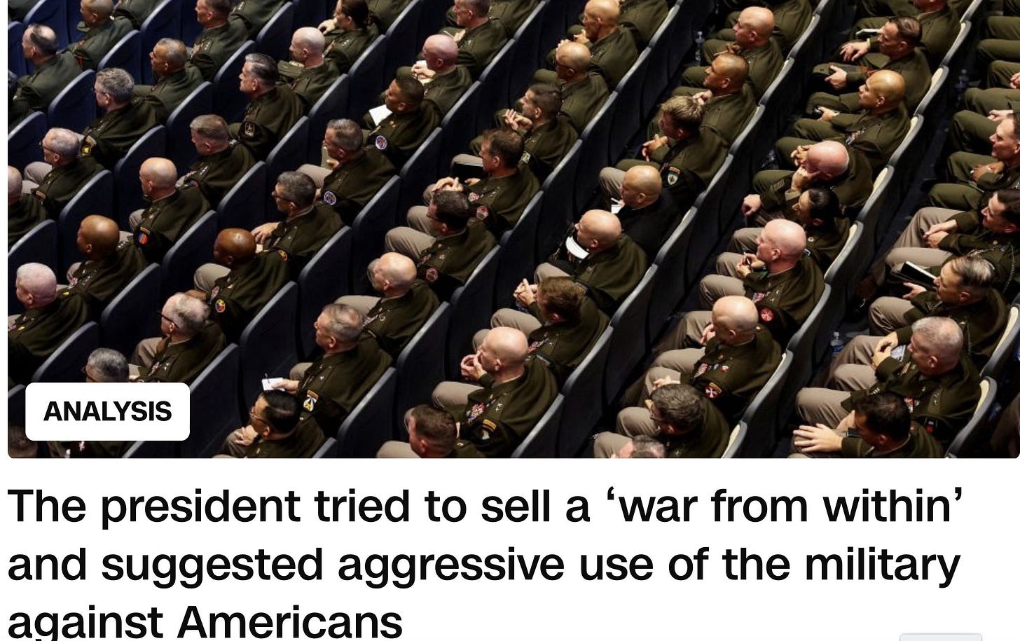 Mentre la Flotilla si avvicina alle acque prospicienti Gaza e l’alleanza colonialista si prepara all’assalto finale contro il genere umano, in Virginia si riunisce l’assemblea generale delle Forze Armate nordamericane. Il violentatore Hegseth ordina ai generali di essere veri maschi e Donald Trump annuncia che il principale obiettivo dell’azione armata è sconfiggere “the internal enemy”.