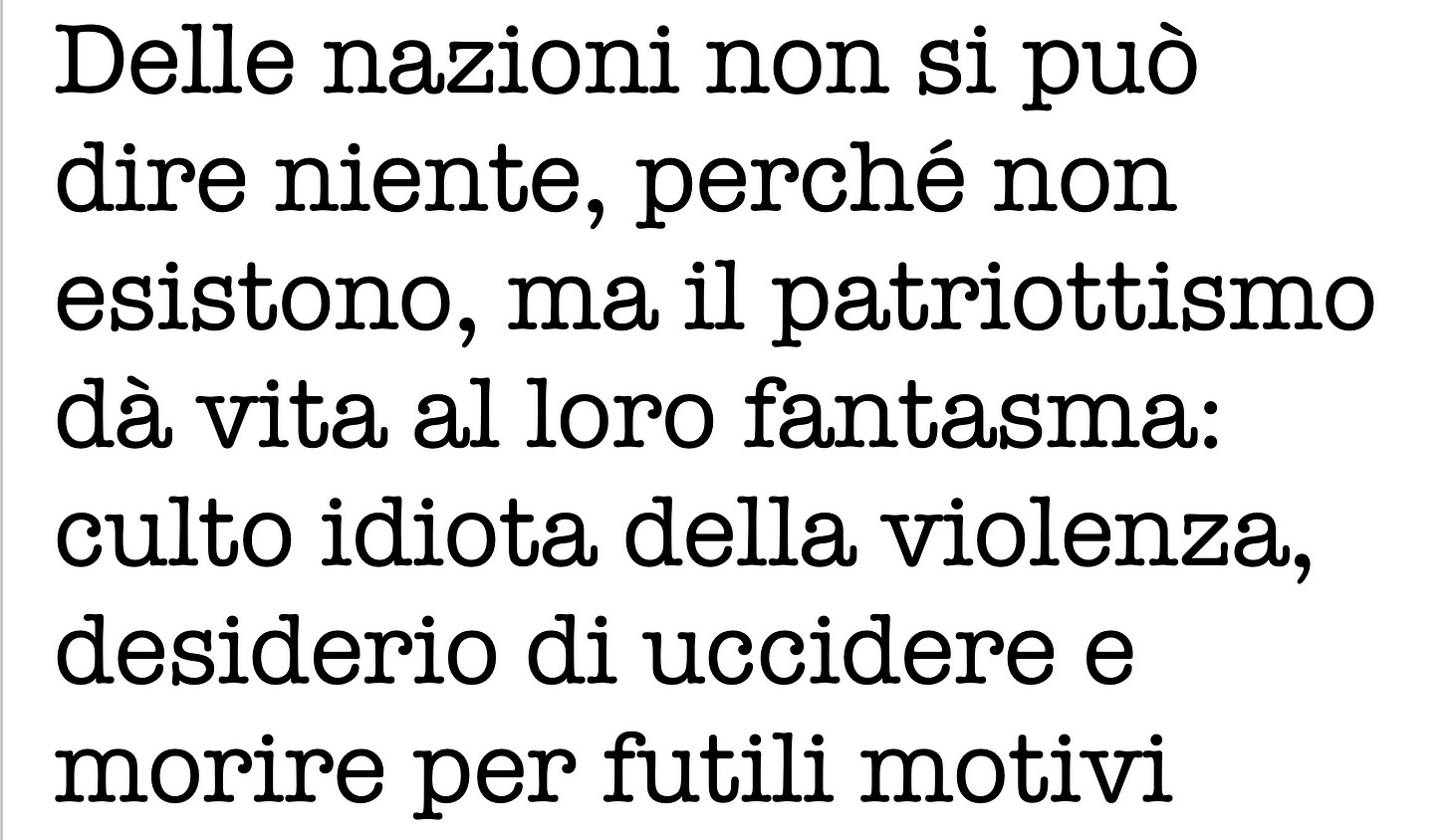 In generale la storia delle nazioni ha qualcosa di ridicolo, ma la storia nazionale italiana è ridicola a massimo grado, anche se disgraziatamente rotola nel tragico ogni qual volta i proclami e le pose devono misurarsi con la realtà delle guerre nazionali o della competizione economica.